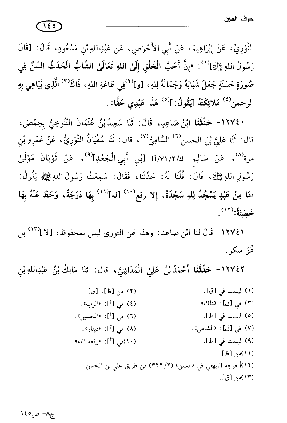 12740 - حَدثنا ابن صاعد، قال: حَدثنا سعيد بن عثمان التنوخي بحمص، قال: حَدثنا عَلي بن الحَسَن السَّامِي، قال: حَدثنا سفيان الثَّوري، عن عَمرو بن مرة، عن سالم بن أبي الجعد، عن ثوبان مولى رسول الله صَلى الله عَليه وسَلم، قال: قلنا له: حَدثنا، فقال: سمعتُ رسول الله صَلى الله عَليه وسَلم يقول: ما من عَبد يسجد لله سجدة، إلا رفع له بها درجة (1)، وحط عنه بها خطيئة.