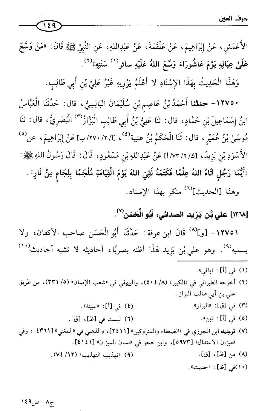 12751 - وقال ابن عرفة: حَدثنا أَبو الحسن صاحب الأكفان، ولا يسميه، وهو علي بن يزيد هذا، أظنه بصريا، أحاديثه لا تشبه أحاديث الثقات، إما أن يأتي بإسناد لا يُتَابَعُ عَليه، أو بمتن عن الثقات منكر، أو يروي عن مجهول.