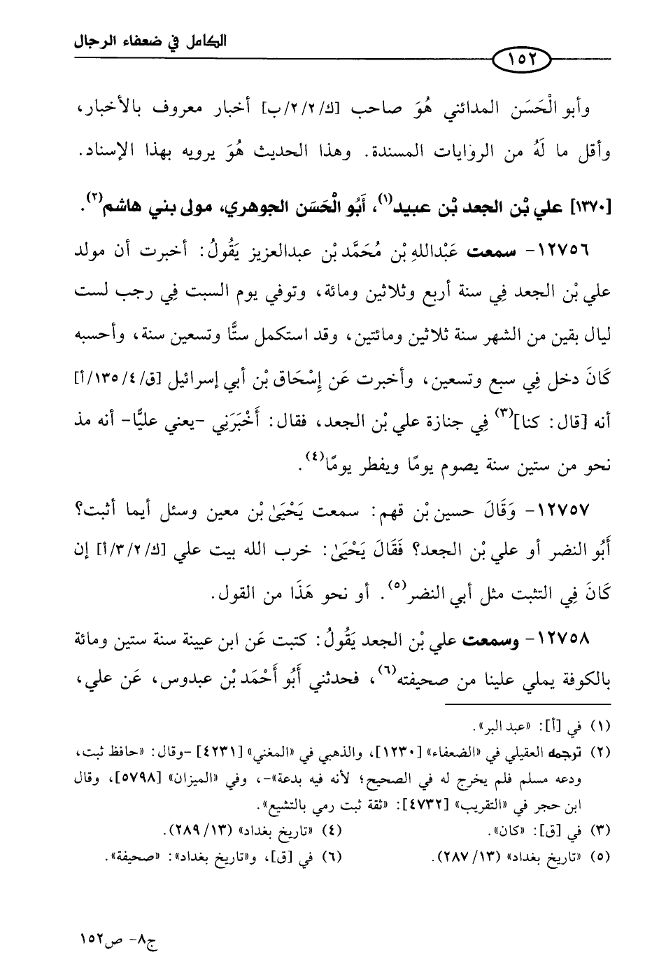 12758 - وسمعت علي بن الجعد يقول: كتبت عن ابن عُيَينة سنة ستين ومائة بالكوفة، يملي علينا من صحيفته، فحدثني أَبو أحمد بن عبدوس، عن علي قال: وكان له في ذلك الوقت جمل يسقي عليه، ورأيت عند مُحمد بن علي الوراق حديث ابن عُيَينة، قد كتبه عن علي بن الجعد، فقلت: متى كتبتموها عن علي؟ فقال: أملاها علينا علي سنة إحدى عشرة ومِائَتين، وكنا حضورا عند علي، فقلت لمحمد بن علي: كيف وهم قد سمعوها من ابن عُيَينة؟ فقال: الألفاظ التي فيها، ولأن عَليًا إنما سمعها من ابن عُيَينة من كتابه.