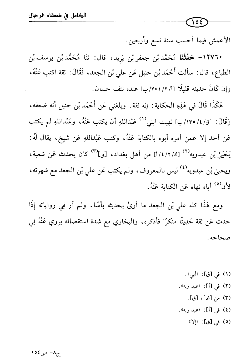 هكذا قال في هذه الحكاية إنه ثقة، وبلغني عن أحمد بن حنبل أنه ضعفه، وقال: نهيت ابني عَبد الله أن يكتب عنه، وعَبد الله لم يكتب عن أحد، إلا عَمَّن أمره أبوه بالكتابة عنه، وكتب عَبد الله عن شيخ، يُقال له: يَحيى بن عبدويه، من أهل بغداد، وكان يحدث عن شُعبَة، ويحيى بن عبدويه ليس بالمعروف، ولم يكتب عن علي بن الجعد مع شهرته، لأن أباه نهاه عن الكتابة عنه.