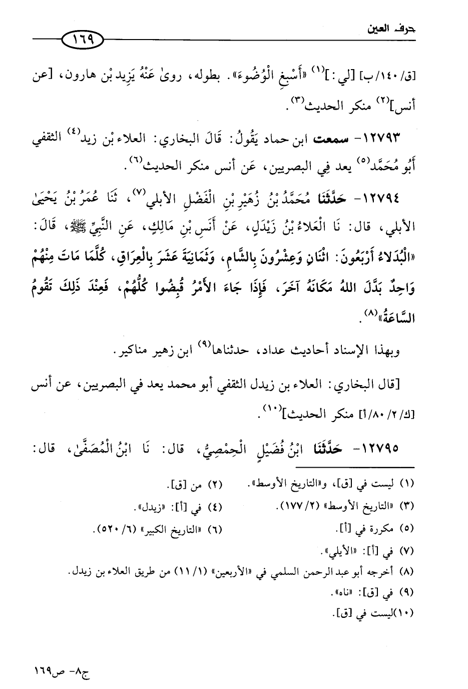 12794 - حَدثنا مُحمد بن زهير بن الفضل الأبلي، حَدثنا عُمر بن يَحيى الأُبُلي، قال: حَدثنا العلاء بن زيدل، عن أَنَس بن مالك، عن النبي صَلى الله عَليه وسَلم قال: البدلاء أربعون، اثنان وعشرون بالشام، وثمانية عشر بالعراق، كلما مات منهم واحد بدل الله مكانه آخر، فإذا جاء الأمر قبضوا كلهم، فعند ذلك تقوم الساعة.