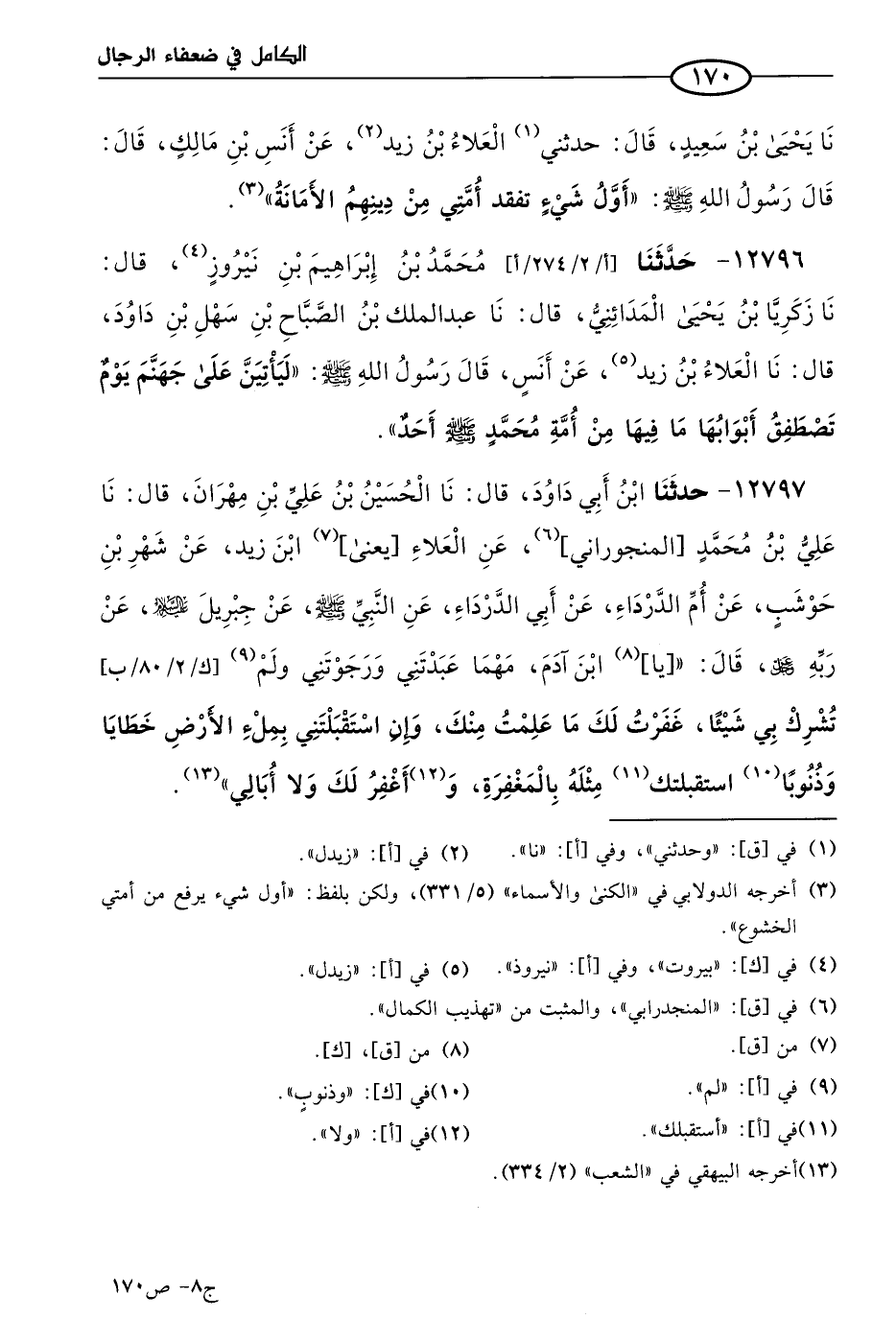 12796 - حَدثنا مُحمد بن إبراهيم بن نيروز، قال: حَدثنا زكريا بن يَحيى المدائني، قال: حَدثنا عَبد الملك بن الصباح بن سهل بن داود، قال: حَدثنا العلاء بن زيد، عن أَنَس، قال رسول الله صَلى الله عَليه وسَلم: ليأتين على جهنم يوم تصطفق أبوابها، ما فيها من أمة مُحمد صَلى الله عَليه وسلم أحد.