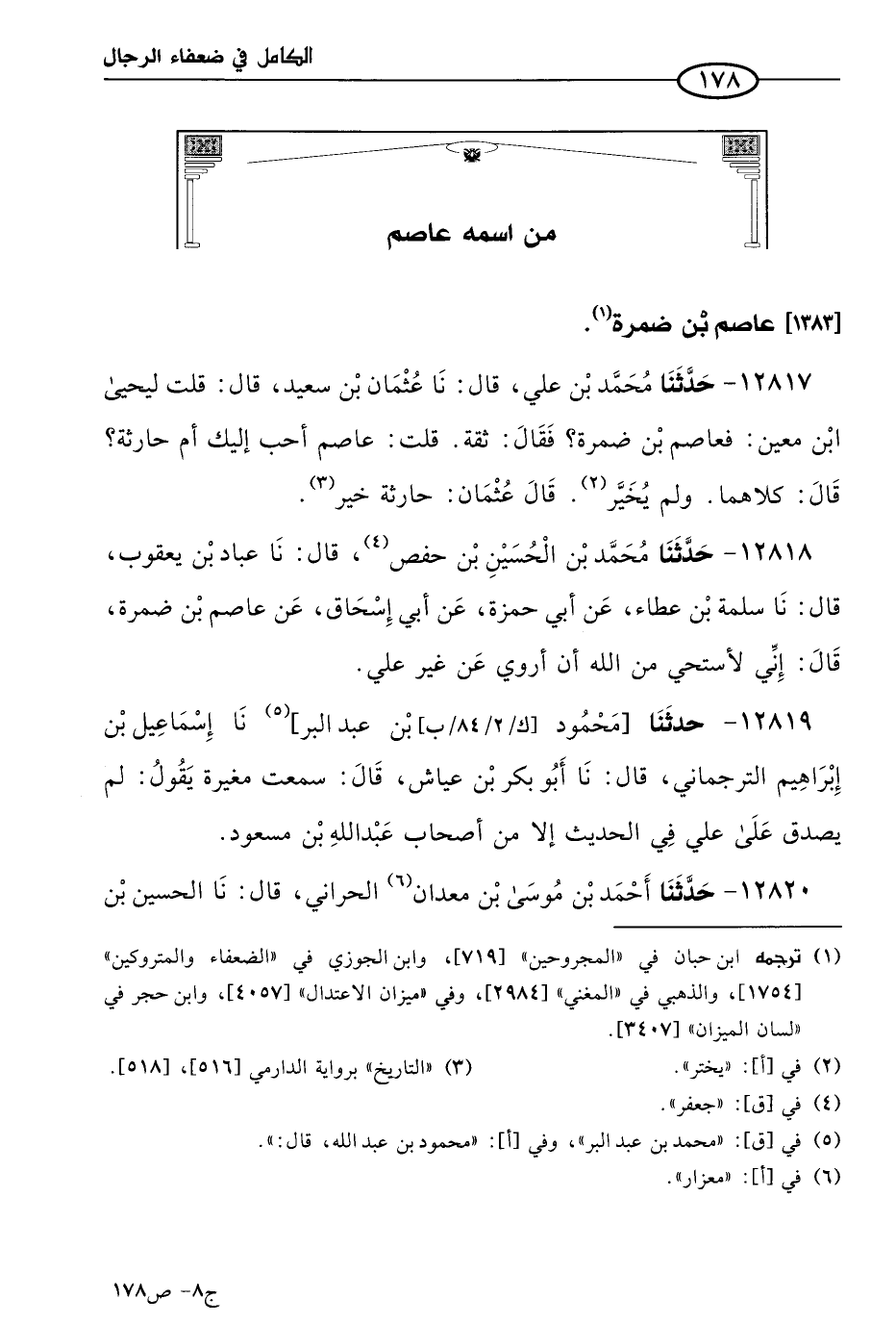 12817 - حَدثنا مُحمد بن علي، قال: حَدثنا عثمان بن سعيد، قال: قلتُ ليحيى بن مَعين: فعاصم بن ضمرة؟ فَقال: ثِقةٌ، قلت: عاصم أَحَب إليك، أم حارثة؟ قال: كلاهما، ولم يُخَير. قال عثمان: حارثة خير.