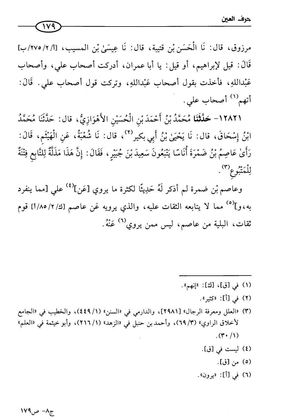وعاصم بن ضمرة لم أذكر له حديثًا، لكثرة ما يروي عن علي، مما ينفرد به، ومما لا يتابعه الثقات عليه، والذي يرويه عن عاصم قوم ثقات، البلية من عاصم ليس ممن يروي عنه.