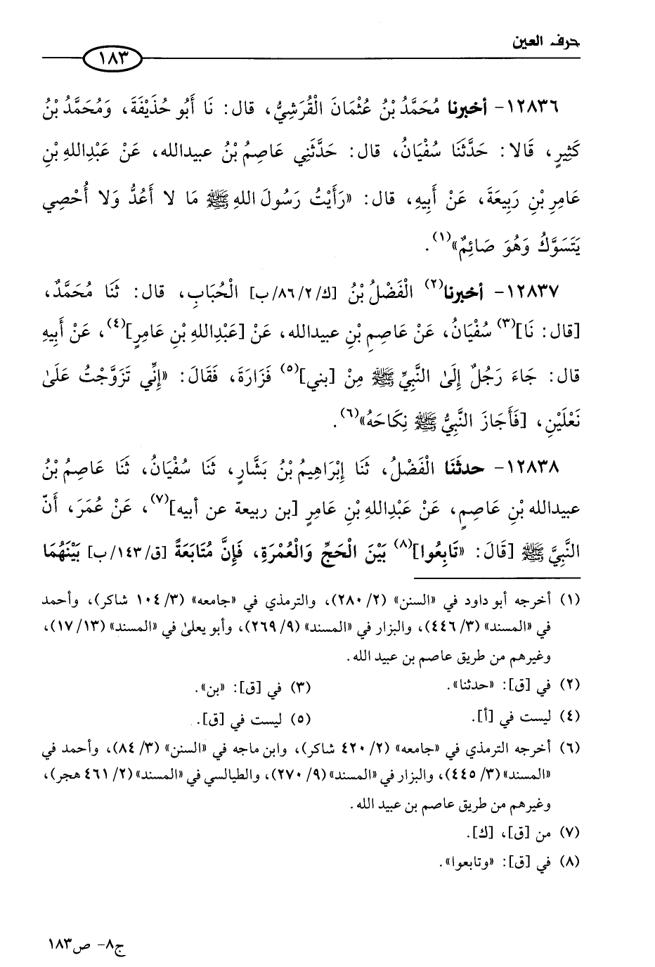 12838 - حَدثنا الفضل، حَدثنا إبراهيم بن بشار، حَدثنا سفيان، حَدثنا عاصم بن عُبيد الله بن عاصم، عن عَبد الله بن عامر بن ربيعة، عُمر؛ أن النبي صَلى الله عَليه وسَلم قال: تابعوا بين الحج والعمرة، فإن متابعة بينهما تنفيان الفقر والذنوب، كما ينفي الكير خبث الحديد، ويزيدان في العمر.