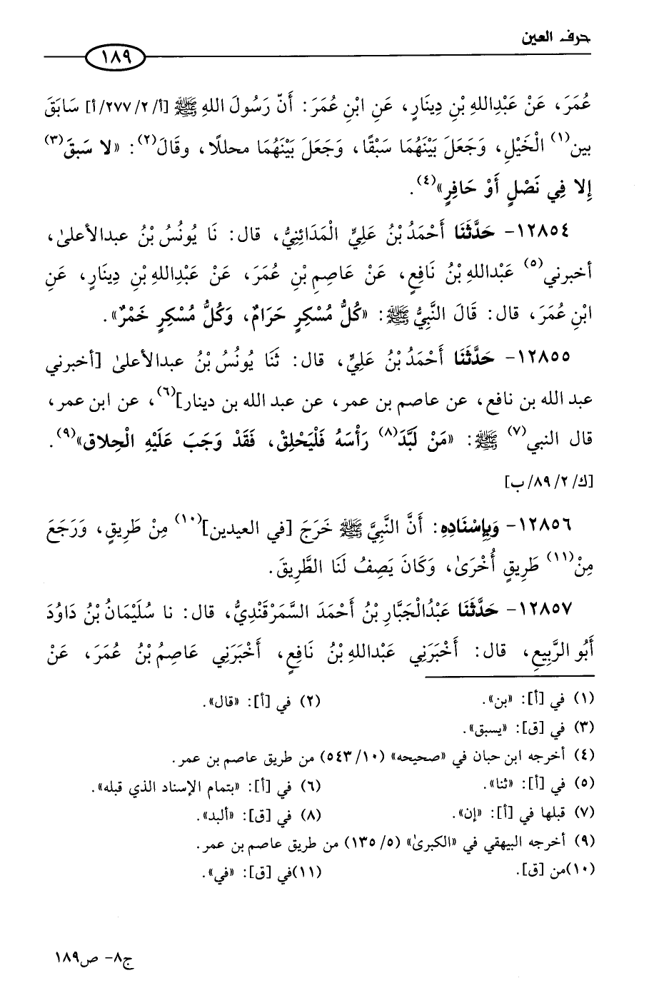 12854 - حَدثنا أحمد بن علي المدائني، قال: حَدثنا يُونُس بن عَبد الأعلى، أخبرني عَبد الله بن نافع، عن عاصم بن عُمر، عن عَبد الله بن دينار، عن ابن عُمر، قال: قال النبي صَلى الله عَليه وسلم: كل مسكر حرام، وكل مسكر خمر.