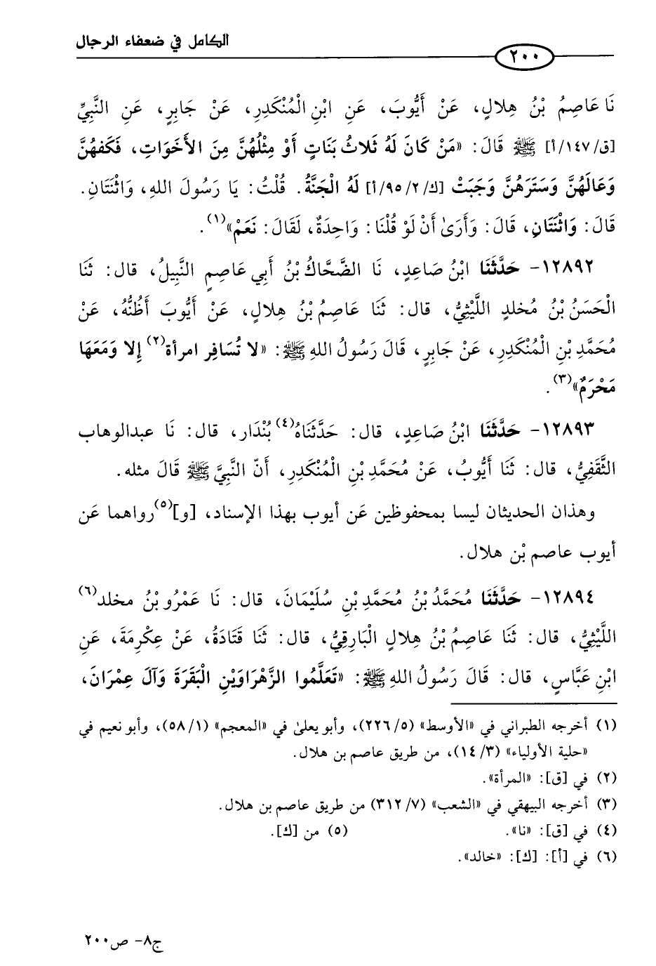12892 - حَدثنا ابن صاعد، حَدثنا الضحاك بن أبي عاصم النبيل، قال: حَدثنا الحسن بن مخلد الليثي، قال: حَدثنا عاصم بن هلال، عن أيوب، أظنه عن مُحمد بن المنكدر، عن جابر، قال رسول الله صَلى الله عَليه وسَلم: لا تسافر امرأة إلا ومعها محرم.