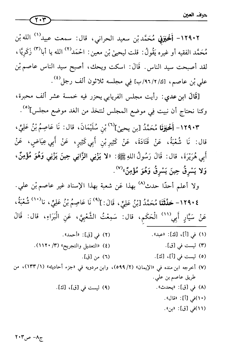 12902 - أخبرني مُحمد بن سعيد الحراني، قال: سمعتُ عُبيد الله بن مُحمد الفقيه، أو غيره يقول: قلت ليحيى بن مَعين: احمد الله يا أبا زكريا، لقد أصبحت سيد الناس. قال: اسكت، ويحك، أصبح سيد الناس عاصم بن علي بن عاصم، في مجلسه ثلاثون ألف رجل.