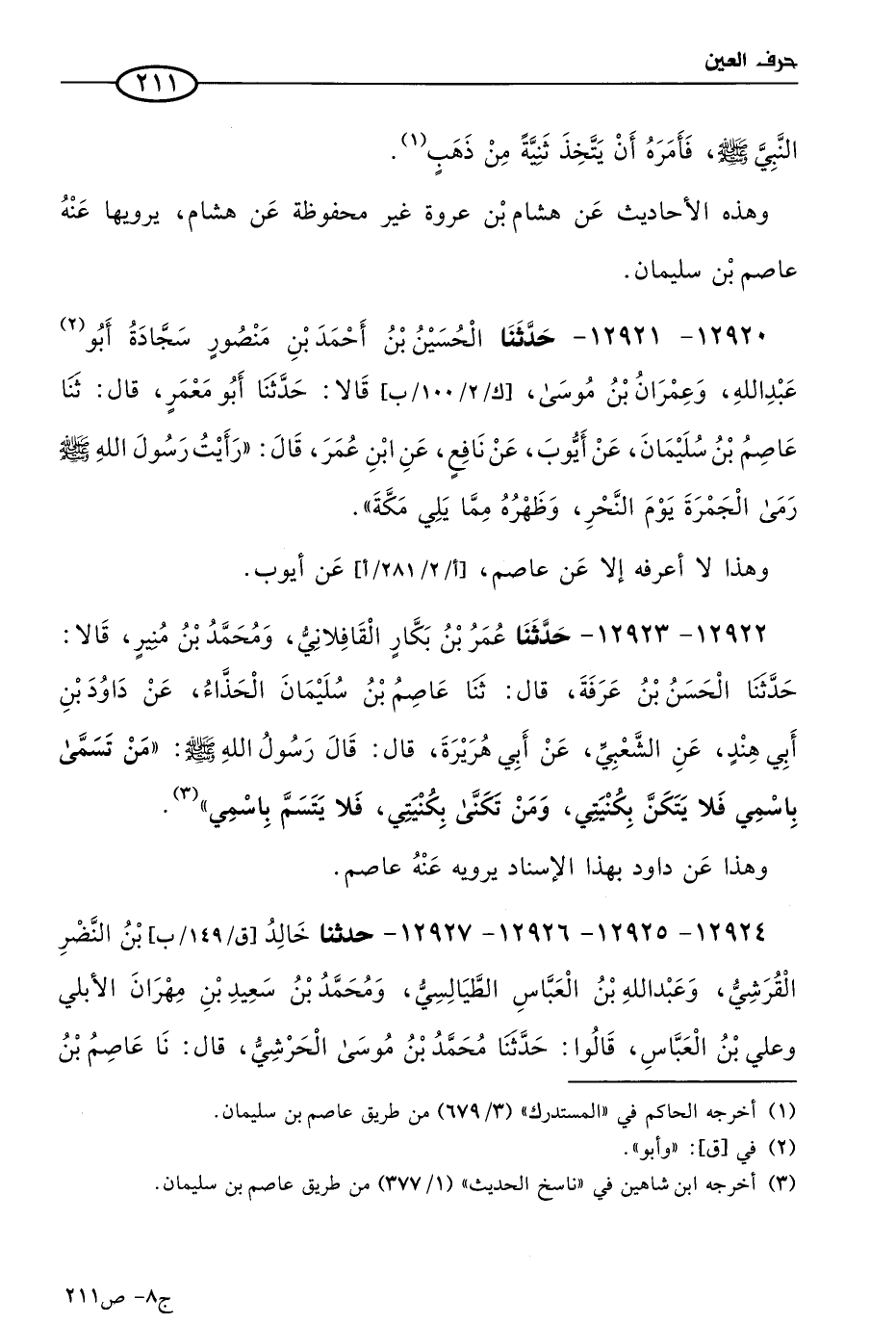 12922 - 12923 - حَدثنا عُمر بن بكار القافلائي، ومُحمد بن منير، قالا: حَدثنا الحسن بن عرفة، قال: حَدثنا عاصم بن سليمان الحذاء، عن داود بن أبي هند، عن الشعبي، عن أبي هريرة، قال: قال رسول الله صَلى الله عَليه وسَلم: من تسمى باسمي، فلا يتكن بكنيتي، ومن تكنى بكنيتي، فلا يتسم باسمي.