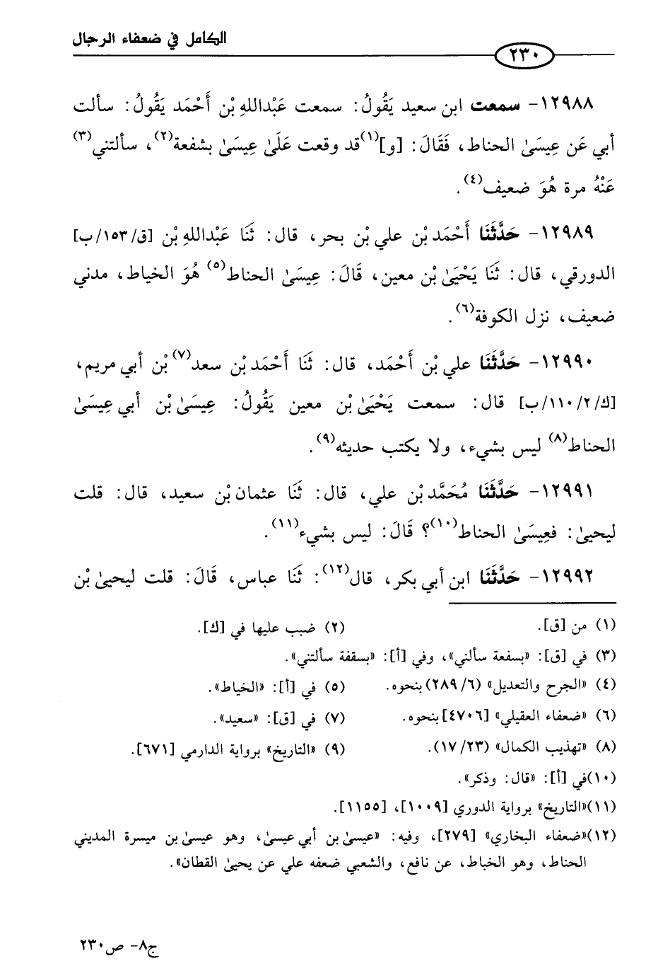 12989 - حَدثنا أحمد بن علي بن بحر، قال: حَدثنا عَبد الله بن الدورقي، قال: حَدثنا يَحيى بن مَعين قال: عيسى الحناط هو الخياط، مدني ضعيف، نزل الكوفة.
