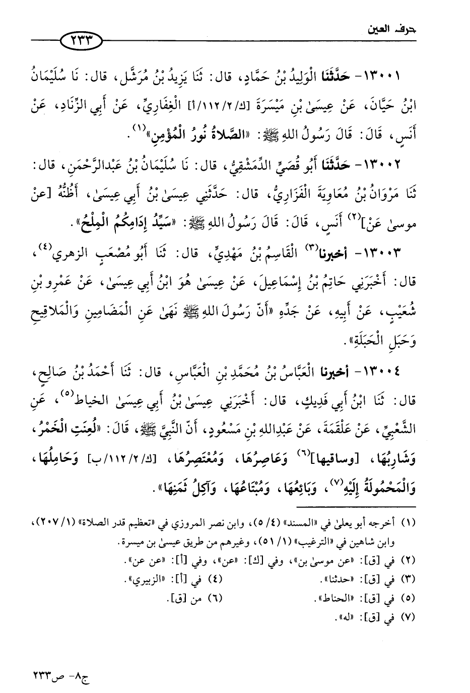 13001 - حَدثنا الوليد بن حماد، قال: حَدثنا يزيد بن مرشد، قال: حَدثنا سليمان بن حيان، عن عيسى بن ميسرة الغفاري، عن أبي الزناد، عن أَنَس، قال: قال رسول الله صَلى الله عَليه وسَلم: الصلاة نور المؤمن.
