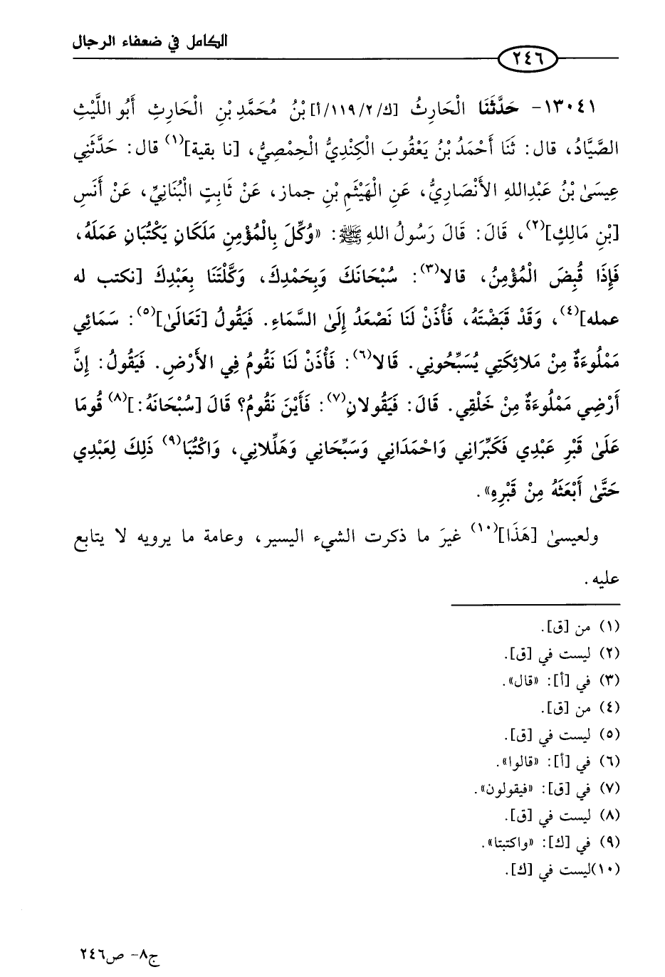 13041 - حَدثنا الحارث بن مُحمد بن الحارث أَبو الليث الصياد، قال: حَدثنا أحمد بن يعقوب الكندي الحِمصِي، حَدثنا بَقِيَة، قال: حَدَّثني عيسى بن عَبد الله الأنصاري، عن الهيثم بن جماز، عن ثابت البناني، عن أَنَس بن مالك، قال: قال رسول الله صَلى الله عَليه وسَلم: وكل بالمؤمن ملكان يكتبان عمله، فإذا قبض المؤمن، قالا: سبحانك وبحمدك، وكلتنا بعبدك نكتب عمله، فكتب له عمله، وقد قبضته فأذن لنا نصعد إلى السماء، فيقول تعالى: سمائي مملوءة من ملائكتي يسبحوني، قالا: فأذن لنا نقوم في الأرض، فيقول: إن أرضي مملوءة من خلقي، قال: فيقولان: فأين نقوم؟ قال سبحانه: قوما على قبر عبدي، فكبراني واحمداني، وسبحاني وهللاني، واكتبا ذلك لعبدي حتى أبعثه من قبره.