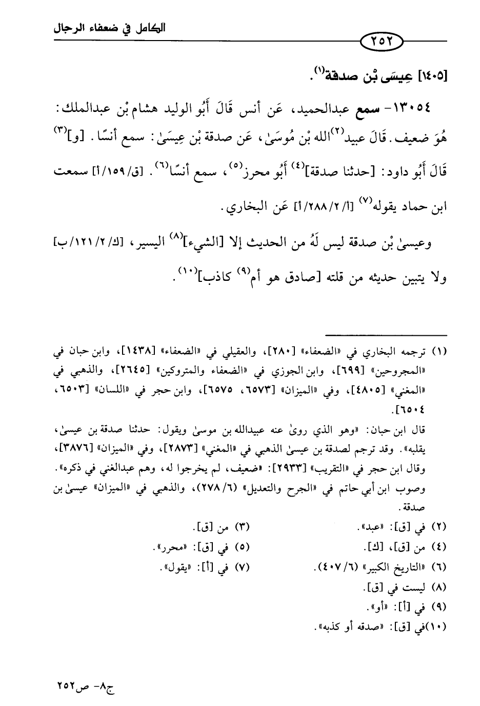 13054 - سمع عَبد الحميد، عن أنس، قال أَبو الوليد هشام بن عَبد الملك: هو ضعيف. قال عُبيد الله بن موسى: عن صدقة بن عيسى، سمع أنسا. وقال أَبو داود: حَدثنا صدقة أَبو محرز، سمع أنسا. سمعتُ ابن حماد يقوله، عن البُخاري.