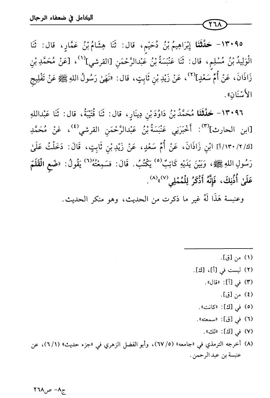 13095 - حَدثنا إبراهيم بن دحيم، قال: حَدثنا هشام بن عمار، قال: حَدثنا الوليد بن مسلم، قال: حَدثنا عنبسة بن عَبد الرحمن القرشي، عن مُحمد بن زاذان، عن أم سعد، عن زيد بن ثابت قال: نهى رسول الله صَلى الله عَليه وسَلم عن تفليج الأسنان.