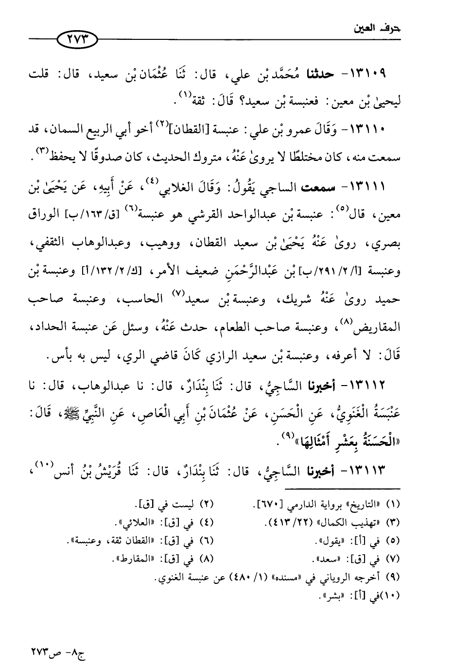 13109 - حَدثنا مُحمد بن علي، قال: حَدثنا عثمان بن سعيد، قال: قلتُ ليحيى بن مَعين: فعنبسة بن سعيد؟ قال: ثقةٌ (1).
