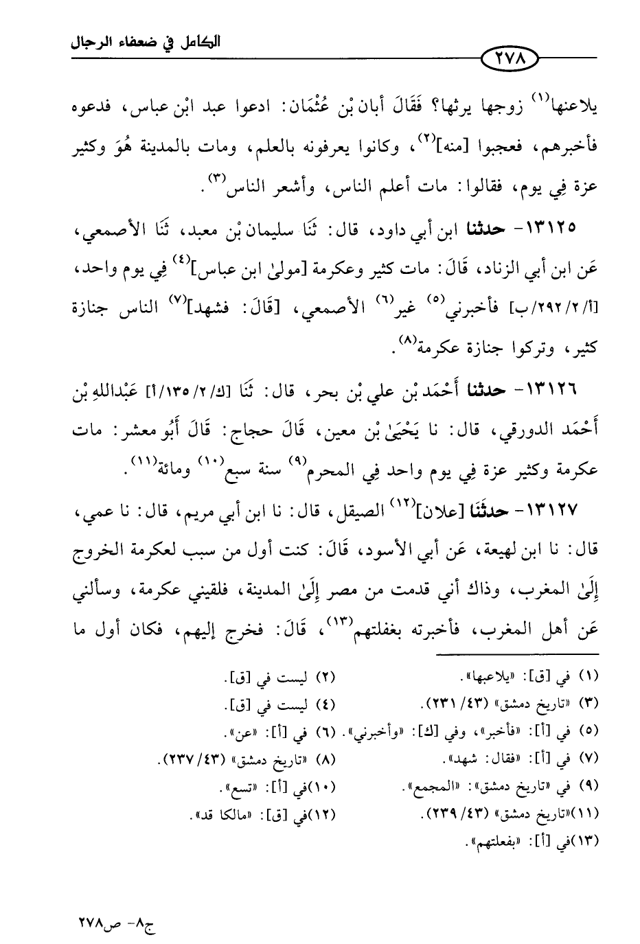 13125 - حَدثنا ابن أبي داود، قال: حَدثنا سليمان بن معبد، حَدثنا الأصمعي، عن ابن أبي الزناد قال: مات كُثَيِّر، وعكرمة مولى ابن عباس في يوم واحد، وأخبرني غير الأصمعي، قال: فشهد الناس جِنازَة كُثَّير، وتركوا جِنازَة عِكرمَة.