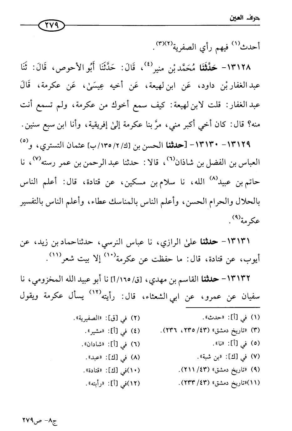 13132 - حَدثنا القاسم بن مهدي، حَدثنا أَبو عُبيد الله المخزومي، حَدثنا سفيان، عن عَمرو، عن أبي الشعثاء قال: رأيته يسأل عِكرمَة، ويقول أَبو الشعثاء: هذا مولى ابن عباس، هذا أعلم الناس.