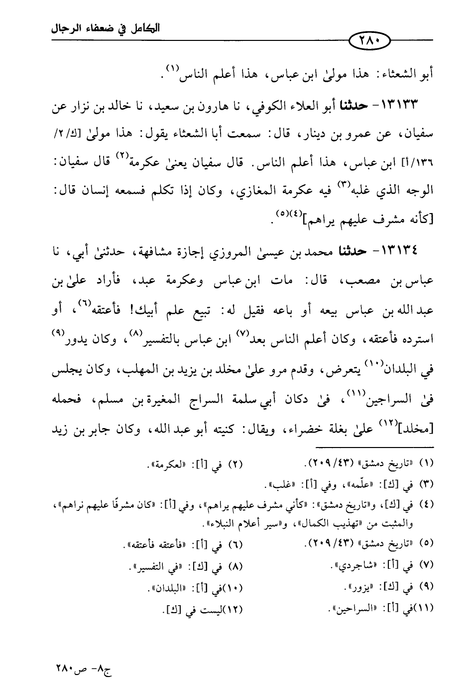 13133 - حَدثنا أَبو العلاء الكوفي، حَدثنا هارون بن سعيد، حَدثنا خالد بن نزار، عن سُفيان، عن عَمرو بن دينار، قال: سمعتُ أبا الشعثاء يقول: هذا مولى ابن عباس، هذا أعلم الناس. قال سفيان، يعني لعكرمة. قال سفيان: الوجه الذي غلبه فيه عِكرمَة المغازي، وكان إذا تكلم فسمعه إنسان قال: كأنه مشرف عليهم يراهم.
