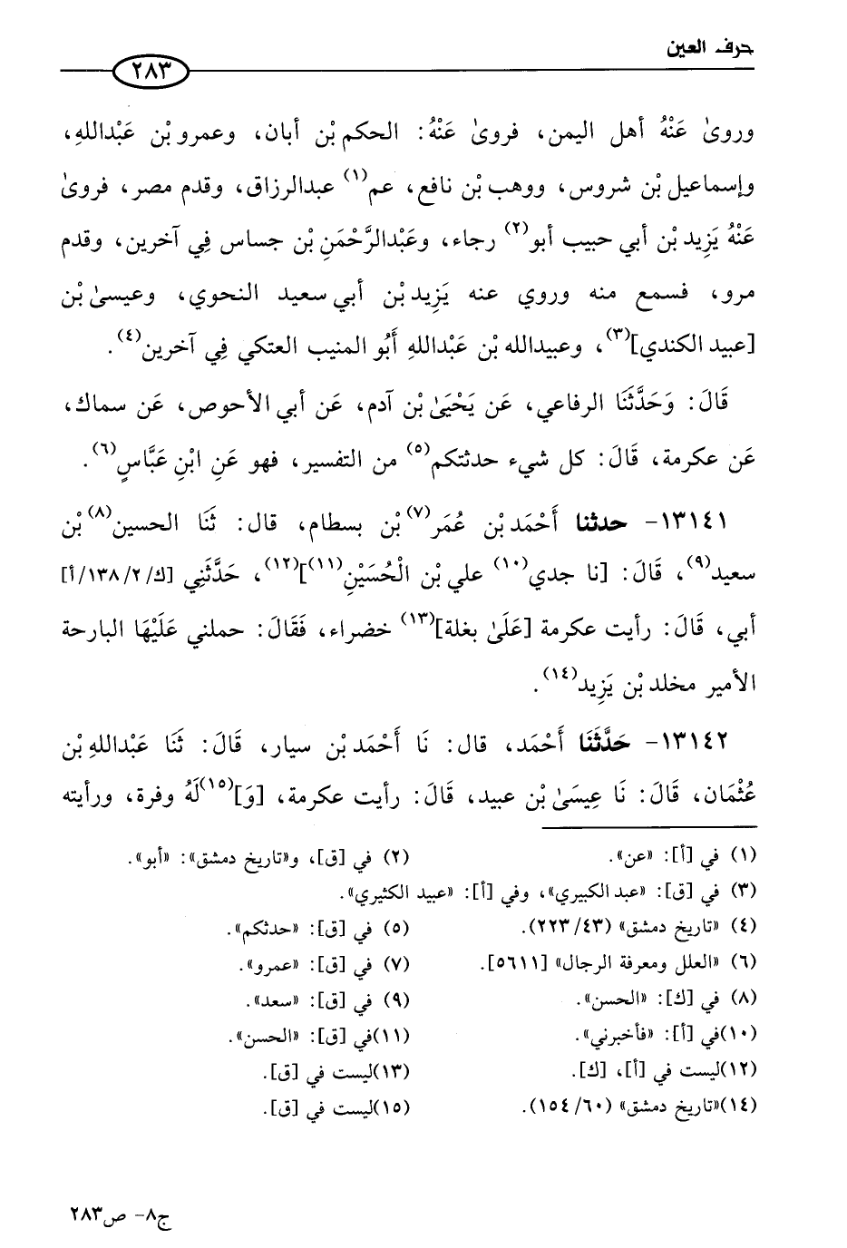 13141 - حَدثنا أحمد بن عُمر بن بسطام، قال: حَدثنا الحسين بن سعيد، قال: حدثنا جدي علي بن الحسين، حَدَّثني أبي، قال: رأيتُ عِكرمَة على بغلة خضراء، فقال: حملني عليها البارحة الأمير مخلد بن يزيد.