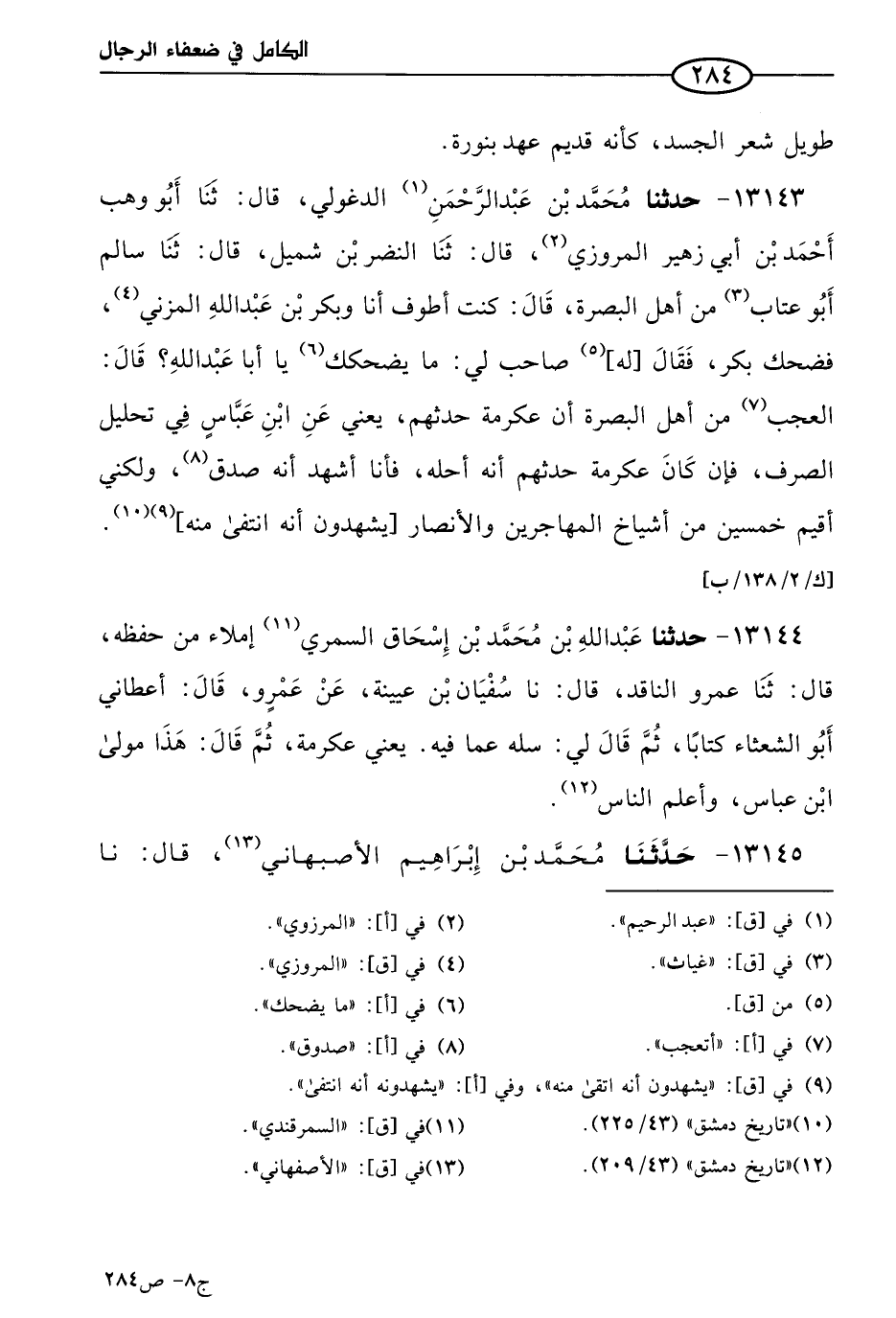 13144 - حَدثنا عَبد الله بن مُحمد بن إسحاق السمري، إملاء من حفظه، قال: حَدثنا عَمرو الناقد، قال: حدثنا سفيان بن عُيَينة، عن عَمرو، قال: أعطاني أَبو الشعثاء كتابا، ثم قال لي: سله عما فيه، يعني عِكرمَة، ثم قال: هذا مولى ابن عباس، وأعلم الناس.