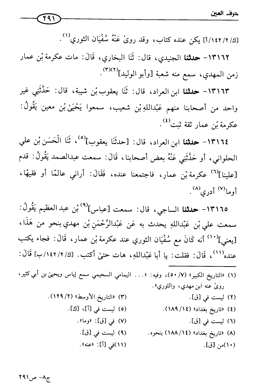 13163 - حَدثنا ابن العراد، قال: حَدثنا يعقوب بن شيبة، قال: حَدَّثني غير واحد من أصحابنا، منهم عَبد الله بن شُعَيب، سمعوا يَحيى بن مَعين يقول: عِكرمَة بن عمار ثقة ثبت.