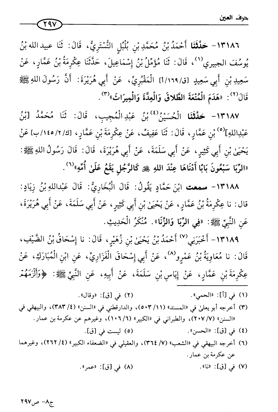 13187 - حَدثنا الحسين بن عَبد المجيب، قال: حَدثنا مُحمد بن عَبد الله بن عمار، قال: حَدثنا عفيف، عن عِكرمَة بن عمار، عن يَحيى بن أبي كثير، عن أبي سلمة، عن أبي هريرة، قال: قال رسول الله صَلى الله عَليه وسَلم: الربا سبعون بابا، أدناها عند الله عَزّ وجَلّ كالرجل يقع على أمه.