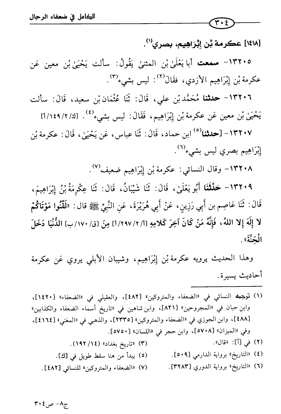 13207 - حَدثنا ابن حماد، قال: حَدثنا عباس، عن يَحيى، قال: عِكرمَة بن إبراهيم بصري ليس بشَيءٍ.