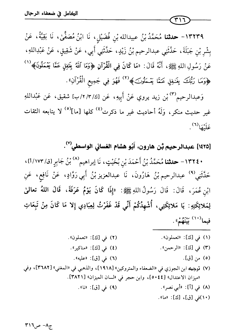 13240 - حَدثنا مُحمد بن أحمد بن بخيت، حَدثنا إبراهيم بن جابر، حَدَّثني عَبد الرحيم بن هارون، حَدثنا عَبد العزيز بن أبي رَوَّاد، عن نافع، عن ابن عُمر، قال: قال رسول الله صَلى الله عَليه وسَلم: إذا كان يوم عرفة، قال الله تعالى لملائكته: يا ملائكتي، أشهدكم أني قد غفرت لعبادي إلا ما كان من تبعات فيما بينهم.