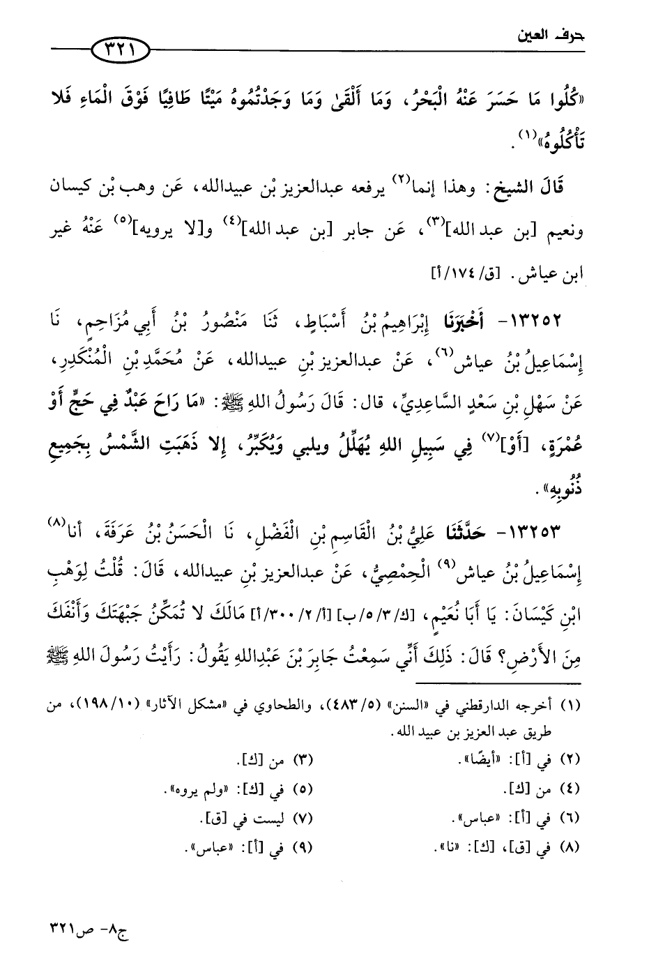 13253 - حَدثنا علي بن القاسم بن الفضل، حَدثنا الحسن بن عرفة، أخبرنا إسماعيل بن عياش الحِمصِي، عن عَبد العزيز بن عُبيد الله، قال: قلتُ لوهب بن كيسان: يا أبا نعيم، مالك لا تمكن جبهتك وأنفك من الأرض؟ قال: ذلك أني سمعت جابر بن عَبد الله يقول: رأيت رسول الله صَلى الله عَليه وسَلم يسجد على أعلى جبهته على قصاص الشعر.