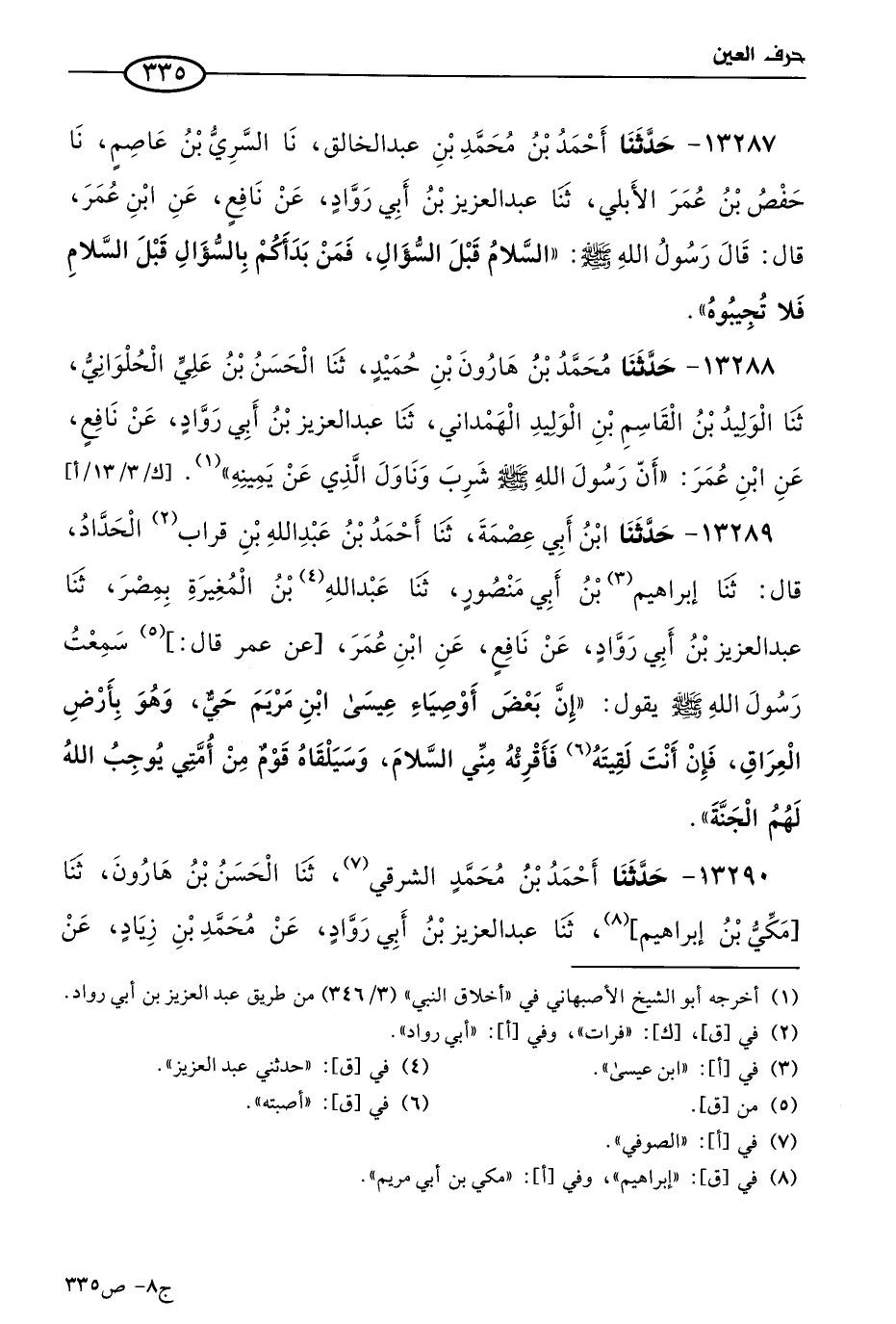 13287 - حَدثنا أحمد بن مُحمد بن عَبد الخالق، حَدثنا السري بن عاصم، حَدثنا حفص بن عُمر الأَيلِي، حَدثنا عَبد العزيز بن أبي رَوَّاد، عن نافع، عن ابن عُمر، قال: قال رسول الله صَلى الله عَليه وسَلم: السلام قبل السؤال، فمن بدأكم بالسؤال قبل السلام فلا تجيبوه.