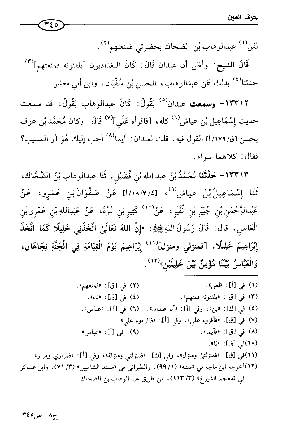 13313 - حَدثنا مُحمد بن عُبيد (1) الله بن فضيل، حَدثنا عَبد الوهاب بن الضحاك، حَدثنا إسماعيل بن عياش، عن صفوان بن عَمرو، عن عَبد الرحمن بن جُبَير بن نفير، عن كثير بن مرة، عن عَبد الله بن عَمرو بن العاص، قال: قال رسول الله صَلى الله عَليه وسَلم: إِنّ الله تعالى اتخذني خليلا، كما اتخذ إبراهيم خليلا، فمنزلي ومنزل إبراهيم يوم القيامة في الجنة تجاهان، والعباس بيننا مؤمن بين خليلين.