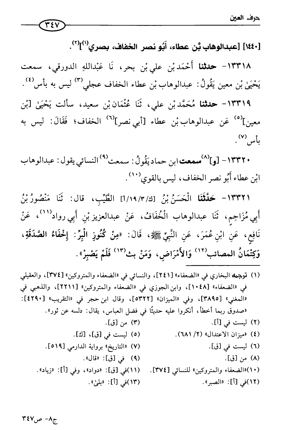 13319 - حَدثنا مُحمد بن علي، حَدثنا عثمان بن سعيد، سألت يَحيى بن مَعين، عن عَبد الوهاب بن عطاء أبي نصر الخفاف، فقال: ليس به بأس.