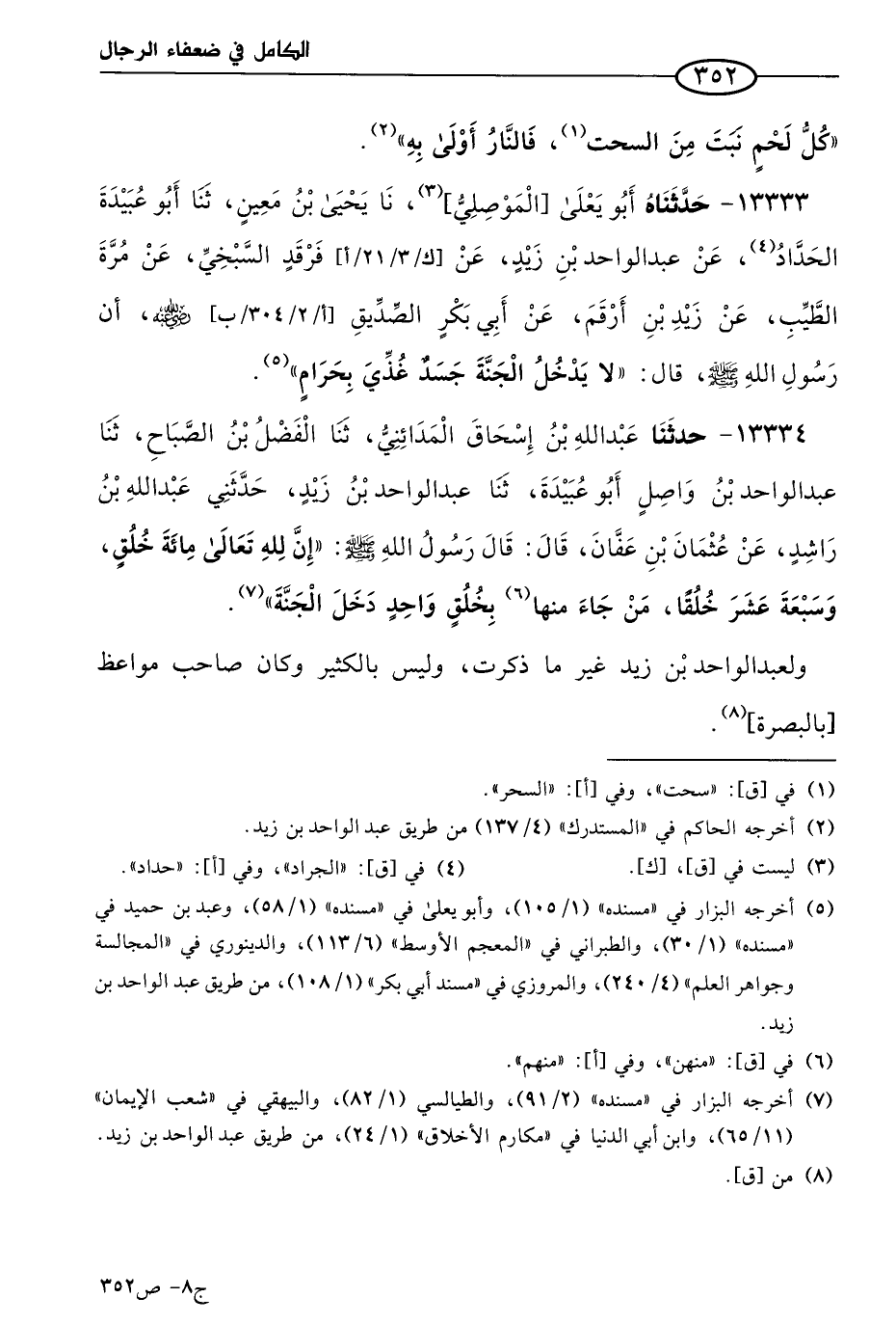 13333 - حدثناه أَبو يَعلَى الموصلي، حَدثنا يَحيى بن مَعين، حَدثنا أَبو عبيدة الحداد، عن عَبد الواحد بن زيد، عن فرقد السبخي، عن مرة الطيب، عن زيد بن أرقم، عن أبي بكر الصديق رضي الله عنه، أن رسول الله صَلى الله عَليه وسَلم قال: لا يدخل الجنة جسد غذي بحرام.