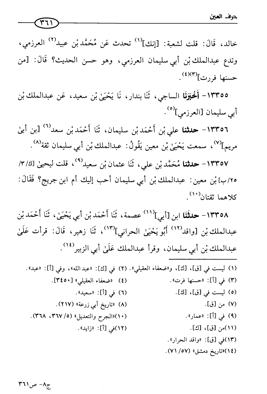 13358 - حَدثنا ابن أبي عصمة، حَدثنا أحمد بن أبي يَحيى، حَدثنا أحمد بن عَبد الملك بن واقد أَبو يَحيى الحراني، حَدثنا زهير قال: قرأت على عَبد الملك بن أبي سليمان، وقرأ عَبد الملك على أبي الزبير.