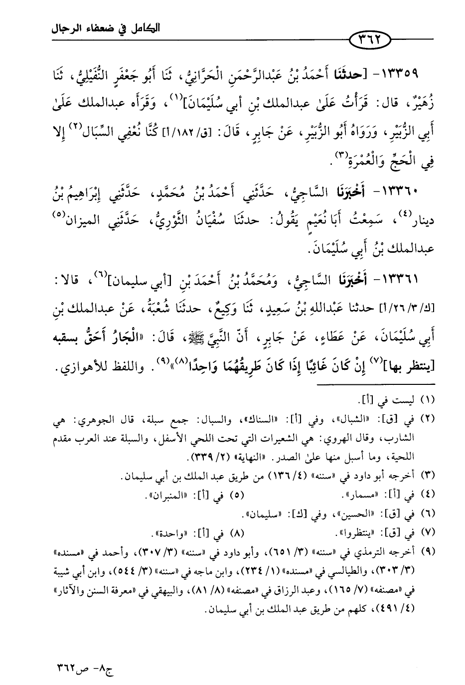 13359 - حَدثنا أحمد بن عَبد الرحمن الحراني، حَدثنا أَبو جعفر النفيلي، حَدثنا زهير، قال: قرأت على عَبد الملك بن سيلمان، وقرأه عَبد الملك على أبي الزبير، ورواه أَبو الزبير عن جابر قال: كُنا نعفي السبال إلا في الحج والعمرة.