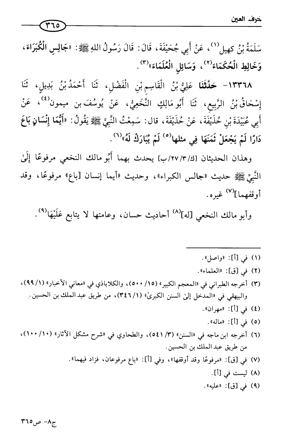 وهذان الحديثان يحدث بهما أَبو مالك النخعي مرفوعا إلى النبي صَلى الله عَليه وسلم: حديث «جالس الكبراء»، وحديث «أيما إنسان باع»، مرفوعان (2)، وقد أوقفهما غيره، وأَبو مالك النخعي له أحاديث حسان وعامتها لا يُتَابَعُ عَليها.