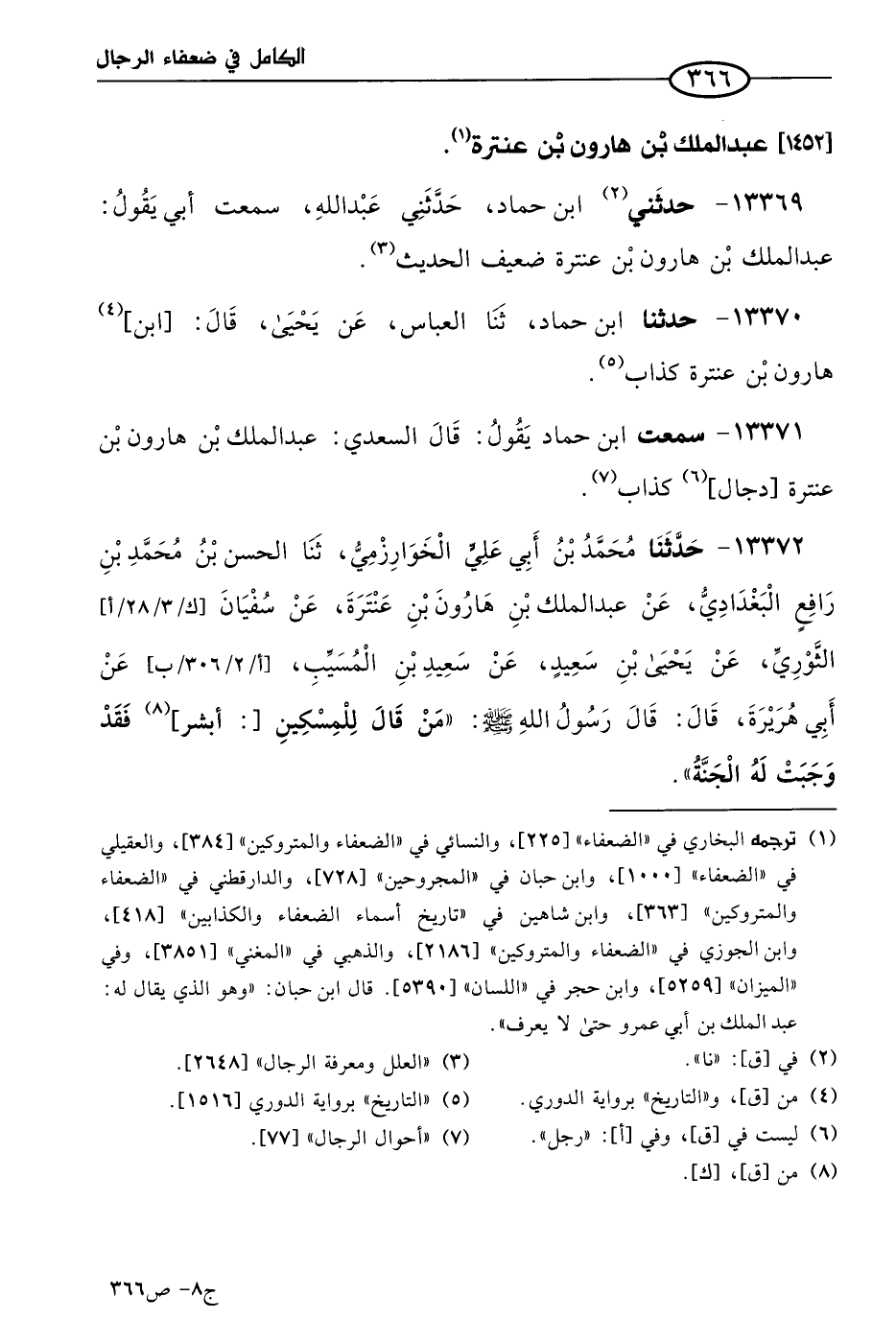 13371 - سمعتُ ابن حماد يقول: قال السعدي: عَبد الملك بن هارون بن عنترة دجال كذاب.