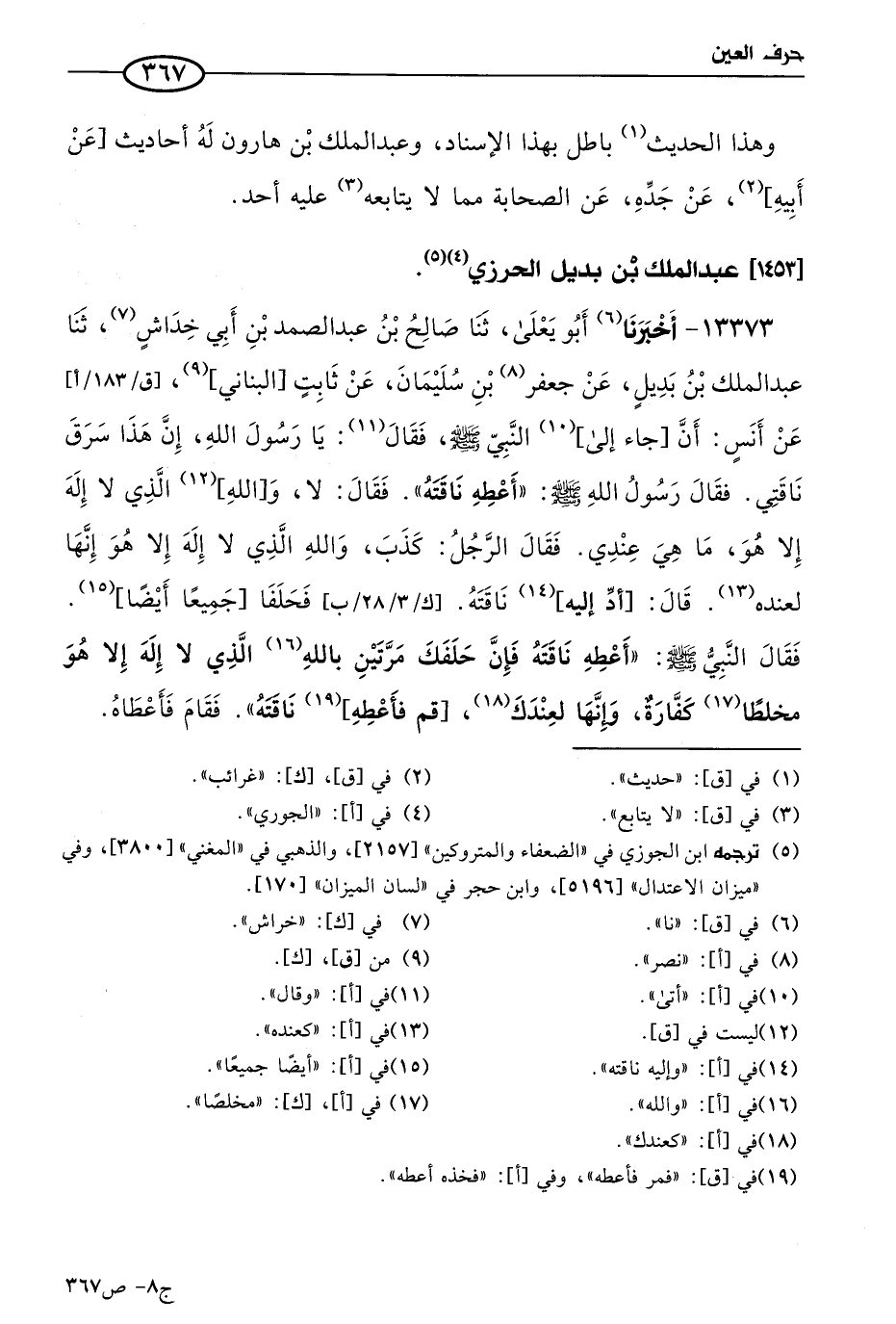 13373 - أخبرنا أَبو يَعلَى، حَدثنا صالح بن عَبد الصمد بن أبي خداش، حَدثنا عَبد الملك بن بديل، عن جعفر بن سليمان، عن ثابت البناني، عن أَنَس؛ أن رجلاً أتى النبي صَلى الله عَليه وسلم فقال: يا رسول الله، إن هذا سرق ناقتي، فقال رسول الله صَلى الله عَليه وسَلم: أعطه ناقته، فقال: لا والله الذي لا إله إلا هو ما هي عندي، فقال الرجل: كذب والله الذي لا إله إلا هو إنها لعنده، قال: أد إليه ناقته، فحلفا جميعًا أَيضًا، فقال النبي صَلى الله عَليه وسلم: أعطه ناقته فإن حلفك مرتين بالله الذي لا إله إلا هو مخلطا (2) كفارة، وإنها لعندك، قم فأعطه ناقته، فقام فأعطاه.