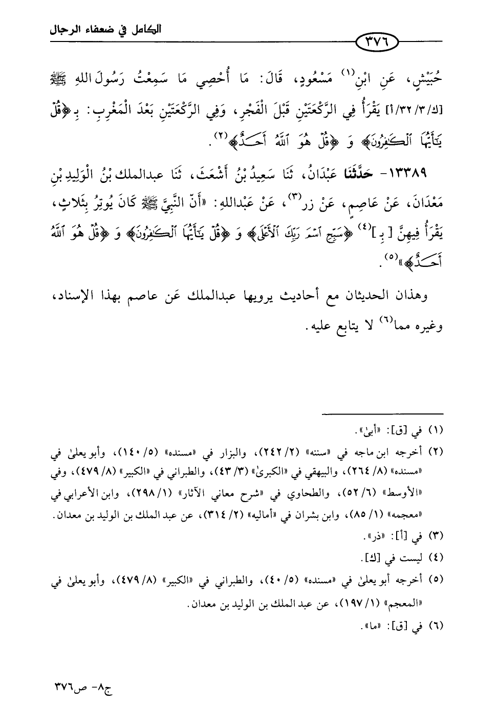 13389 - حَدثنا عبدان، حَدثنا سعيد بن أشعث، حَدثنا عَبد الملك بن الوليد بن معدان، عن عاصم، عن زر عن عَبد الله؛ أن النبي صَلى الله عَليه وسلم كان يوتر بثلاث يقرأ فيهن بـ: {سَبِّح اسم رَبِّك الأَعلَى}، و {قلْ يَا أَيُهَا الكَافِرُونَ}، و {قلْ هُو اللَّهُ أَحَدٌ}.
