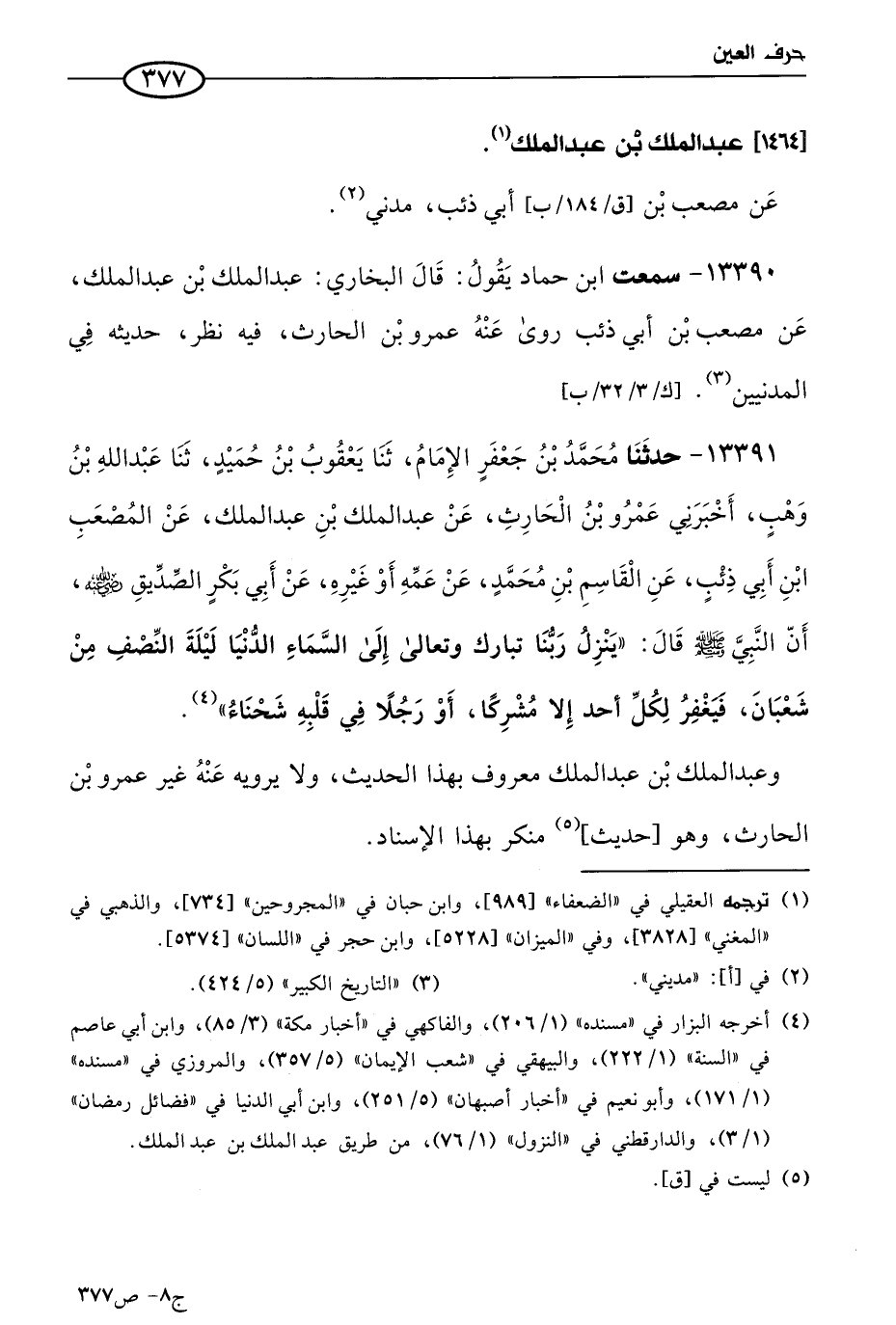 13391 - حَدثنا مُحمد بن جعفر بن (1) الإمام، حَدثنا يعقوب بن حميد، حَدثنا عَبد الله بن وهب، أخبرني عَمرو بن الحارث، عن عَبد الملك بن عَبد الملك، عن المصعب بن أبي ذئب، عن القاسم بن مُحمد، عن عَمِّه، أو غيره، عن أبي بكر الصديق رضي الله عنه؛ أن النبي صَلى الله عَليه وسَلم قال: ينزل ربنا تبارك وتعالى إلى السماء الدنيا ليلة النصف من شعبان، فيغفر لكل أحد، إلا مشركا، أو رجلاً في قلبه شحناء.