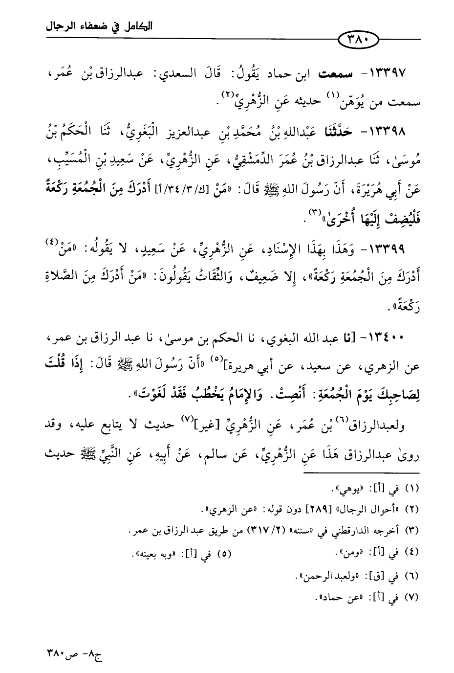 13397 - سمعتُ ابن حماد يقول: قال السعدي: عَبد الرَّزَّاق بن عُمر، سمعت من يوهن حديثه عن الزُّهْري.