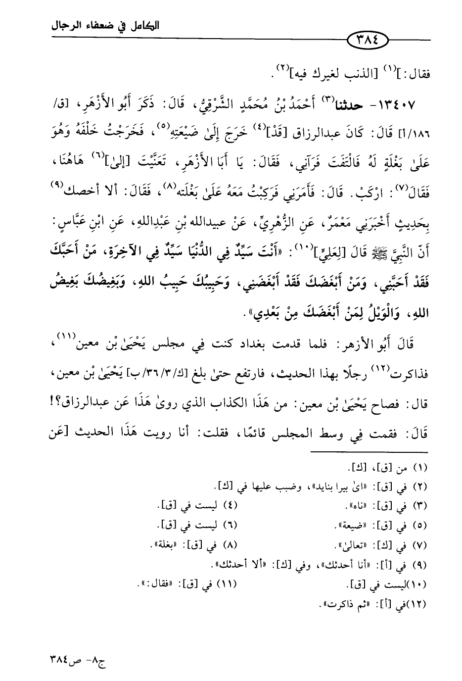 قال أَبو الأزهر: فلما قدمت بغداد كنت في مجلس يَحيى بن مَعين، فذاكرت رجلاً بهذا الحديث فارتفع حتى بلغ يَحيى بن مَعين، قال: فصاح يَحيى بن مَعين: من هذا الكذاب الذي روى هذا عن عَبد الرَّزَّاق؟ قال: فقمت في وسط المجلس قائما، فقلت: أنا رويت هذا الحديث عن عَبد الرَّزَّاق، وذكرت له حين خرجت معه إلى القرية، قال: فسكت يَحيى.