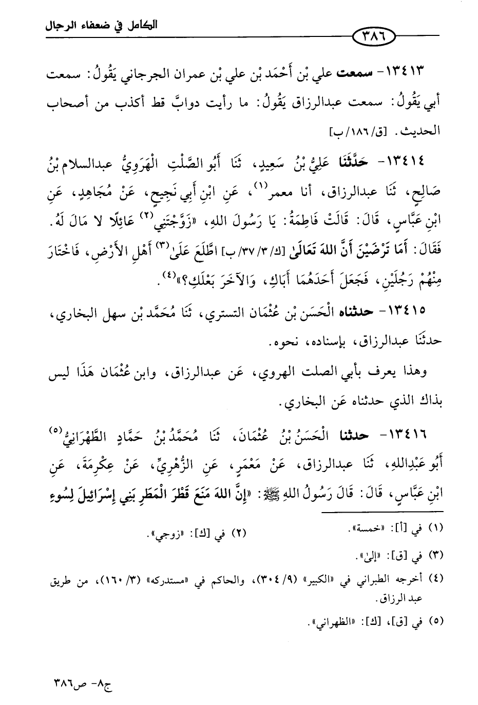 13413 - سمعت علي بن أحمد بن علي بن عمران الجرجاني، يقول: سَمعتُ أبي، يقول: سَمعتُ عَبد الرَّزَّاق يقول: ما رأيت دواب قط أكذب من أصحاب الحديث.