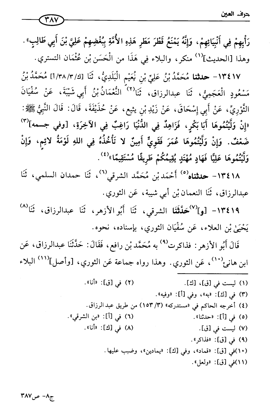 13418 - حدثنا أحمد بن مُحمد الشرقي، حَدثنا حمدان السلمي، حَدثنا عَبد الرَّزَّاق، حَدثنا النعمان بن أبي شيبة، عن الثَّوري.