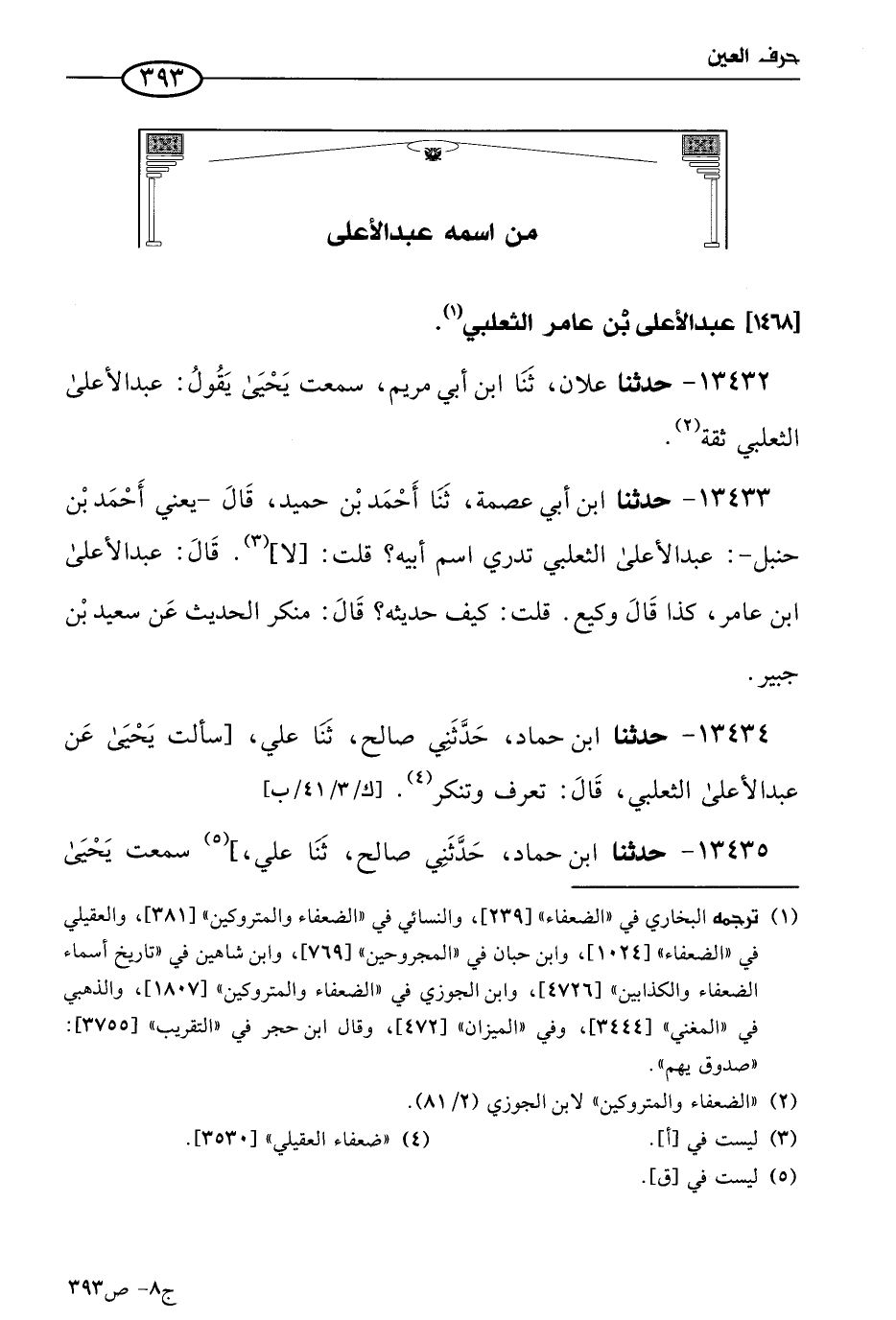 13435 - حَدثنا ابن حماد، حَدَّثني صالح، حَدثنا علي، قال: سمعتُ يَحيى يقول: سألت سفيان الثوري عن أحاديث عَبد الأعلى، عن ابن الحنفية، فوهنها.