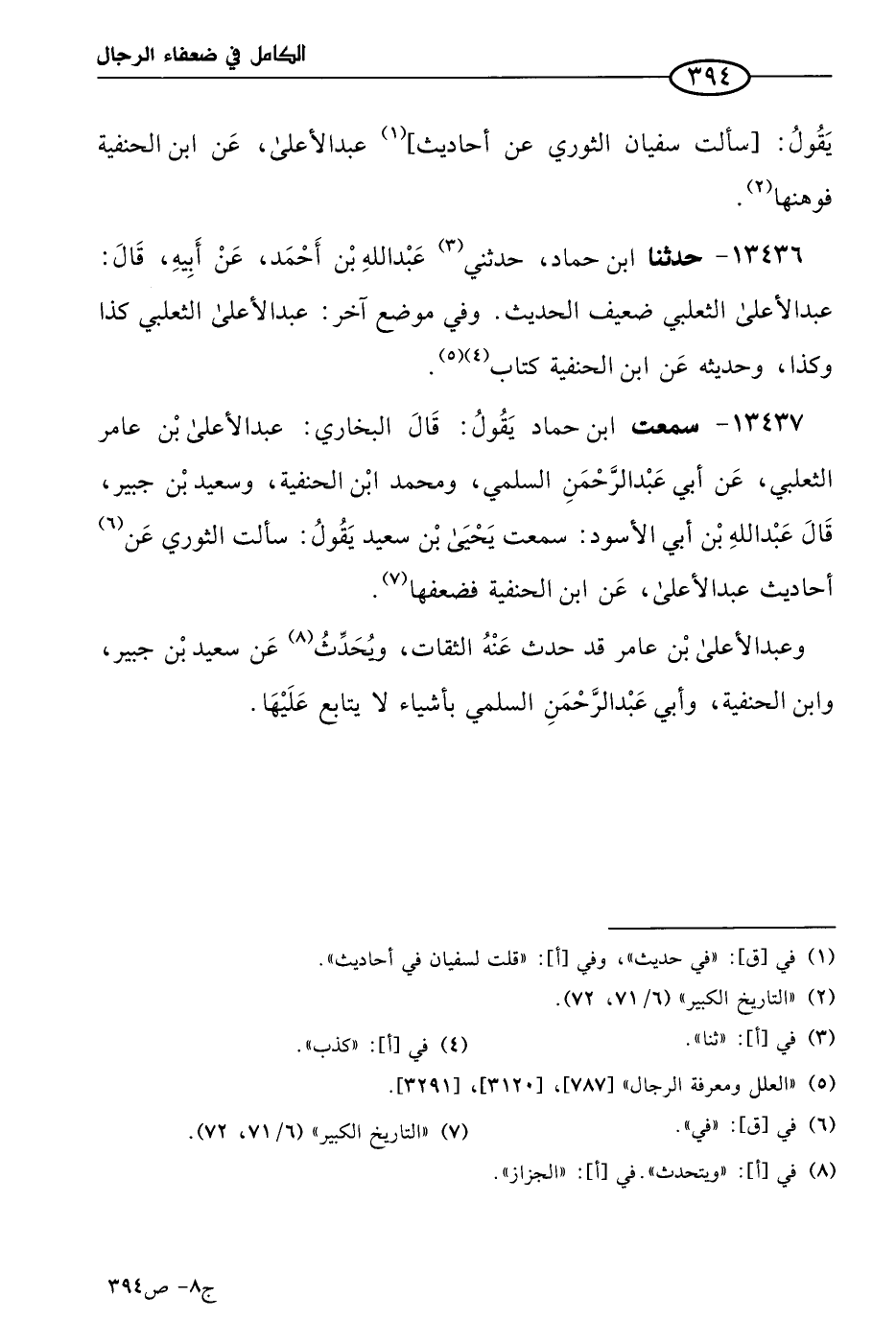 13437 - سمعتُ ابن حماد يقول: قال البُخاري: عَبد الأعلى بن عامر الثعلبي، عن أبي عَبد الرحمن السلمي، ومُحمد بن الحنفية، وسعيد بن جُبَير، قال عَبد الله بن أبي الأسود: سمعت يَحيى بن سعيد يقولُ: سَألتُ الثَّوري عن أحاديث عَبد الأعلى عن ابن الحنفية، فضعفها.