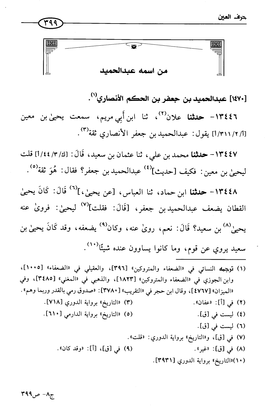 13448 - حَدثنا ابن حماد، حَدثنا العباس، عن يَحيى، قال: كان يَحيى القطان يضعف عَبد الحميد بن جعفر قال: فقلت ليحيى: فروى عنه يَحيى بن سعيد؟ قال: نَعم، روى عنه وكان يضعفه، وقد كان يَحيى بن سعيد يروي عن قوم وما كانوا يساوون عنده شَيئًا.