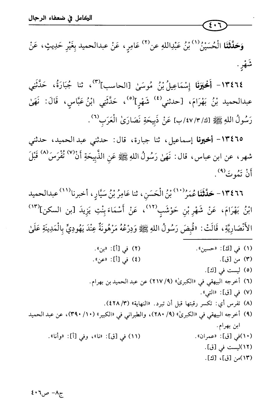 13464 - أخبرنا إسماعيل بن موسى الحاسب، حَدثنا جبارة، حَدَّثني عَبد الحميد بن بهرام، حدثني شهر، حَدَّثني ابن عباس قال: نهى رسول الله صَلى الله عَليه وسَلم عن ذبيحة نصارى العرب.