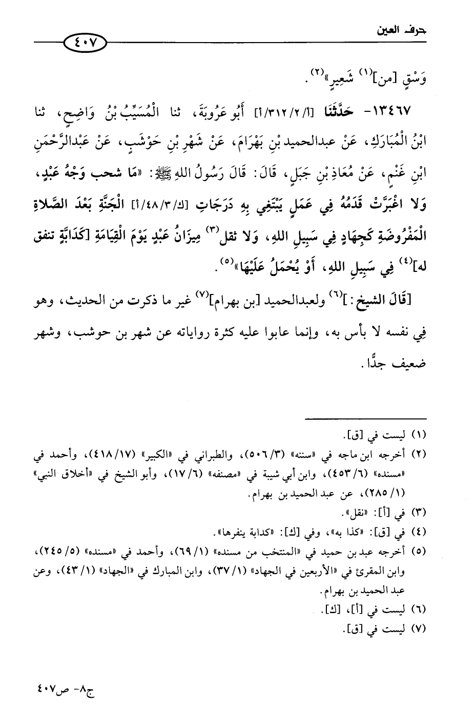 13467 - حَدثنا أَبو عَرُوبة، حَدثنا المُسَيَّب بن واضح، حَدثنا ابن المبارك، عن عَبد الحميد بن بهرام، عن شَهْر بن حَوشَب، عن عَبد الرحمن بن غنم، عن معاذ بن جبل، قال: قال رسول الله صَلى الله عَليه وسَلم: ما شجب وجه عَبد، ولا اغبرت قدمه في عمل يبتغي به درجات الجنة بعد الصلاة المفروضة كجهاد في سبيل الله، ولا ثقل ميزان عَبد يوم القيامة كدابة تنفق له في سبيل الله، أو يحمل عليها.