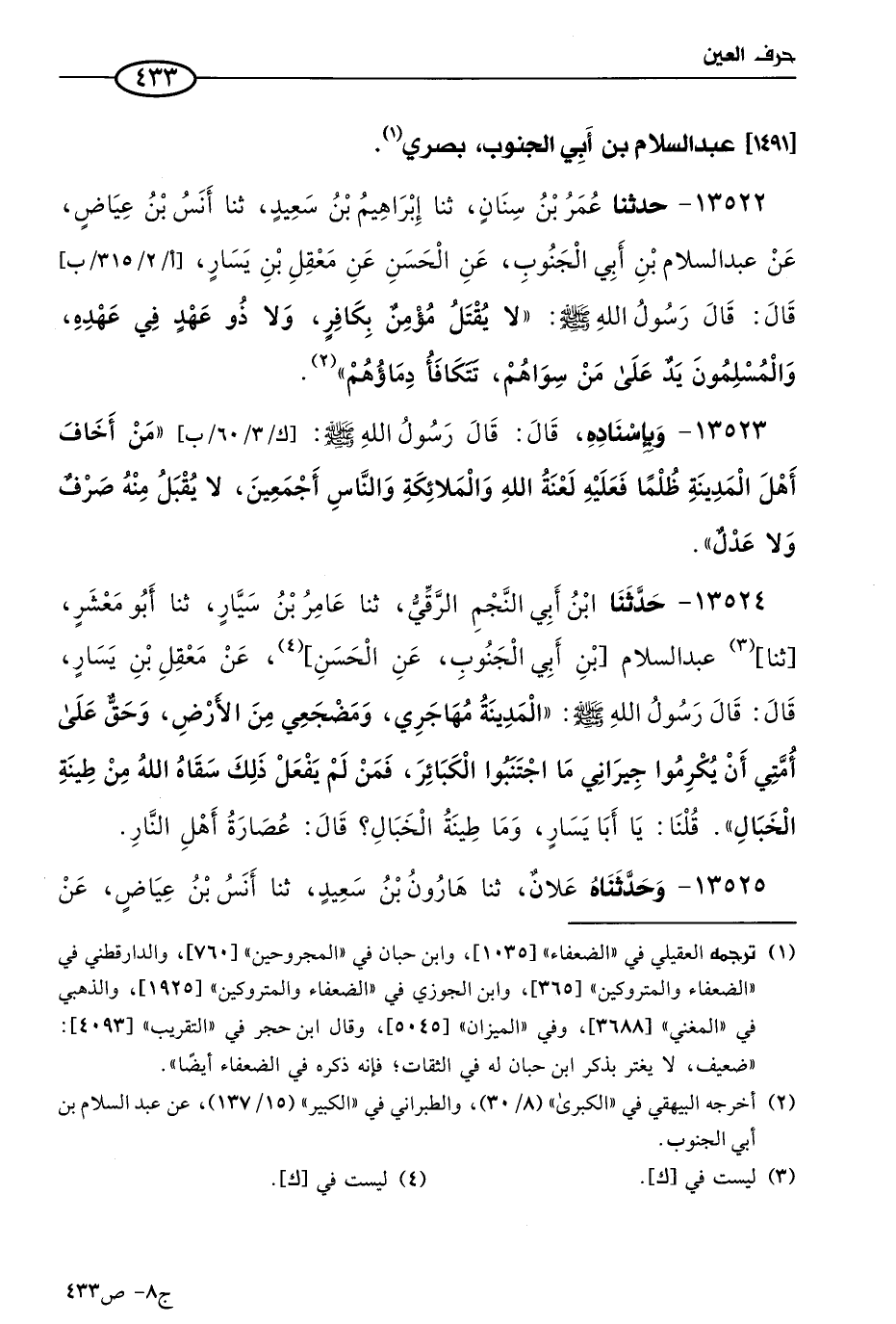 13522 - حَدثنا عُمر بن سنان، حَدثنا إبراهيم بن سعيد، حَدثنا أنس بن عياض، عن عَبد السلام بن أبي الجنوب، عن الحسن، عن معقل بن يسار، قال: قال رسول الله صَلى الله عَليه وسَلم: لا يقتل مؤمن بكافر، ولا ذو عهد في عهده، والمسلمون يد على من سواهم، تتكافأ دماؤهم.